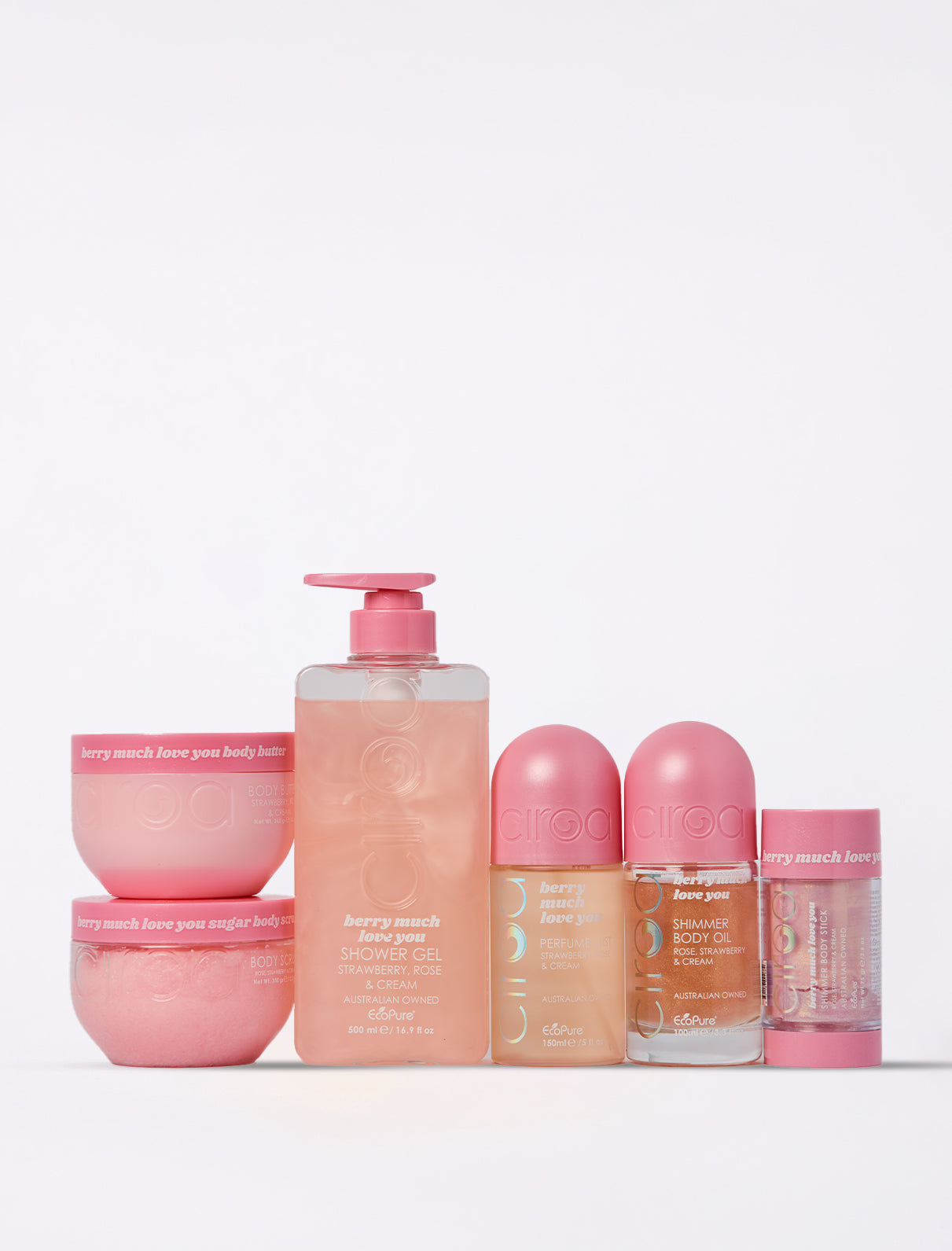 Fall completely head over heels in love with the full Berry Much Love You experience. This indulgent bundle includes the Shimmer Shower Gel, Body Scrub, Body Butter, Shimmer Body Oil, Shimmer Stick and Perfume Mist, each infused with the scent of strawberries & cream and rose to hydrate and leave your skin glowing with luminous radiance from shower to spritz.